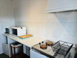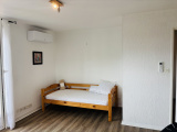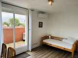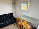 L'entrée comprend un espace de rangement donnant sur la pièce à vivre avec un lit simple et un canapé, la cuisine est séparée, intégrée et équipée.