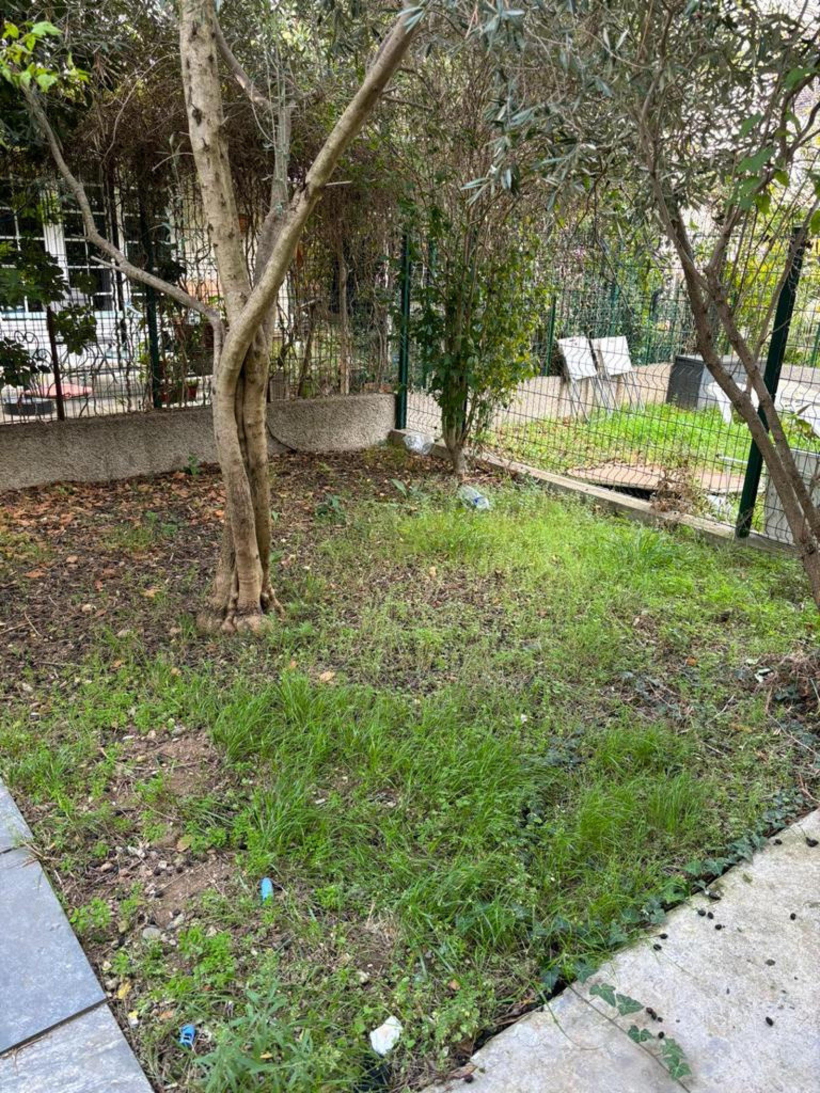 Un grand garage avec jardin et une place de staionnement devant le garage accompagnent ce logement.