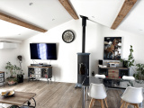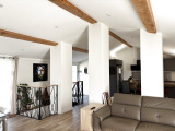 L’intérieur, pensé sur plusieurs niveaux en sous-plex, propose une pièce de vie lumineuse et ouverte sur la nature environnante, articulée autour d’un poêle à bois central, aussi performant qu’esthétique. Le cachet de l'ensemble est renforcé par un escalier sur mesure, véritable œuvre artisanale.