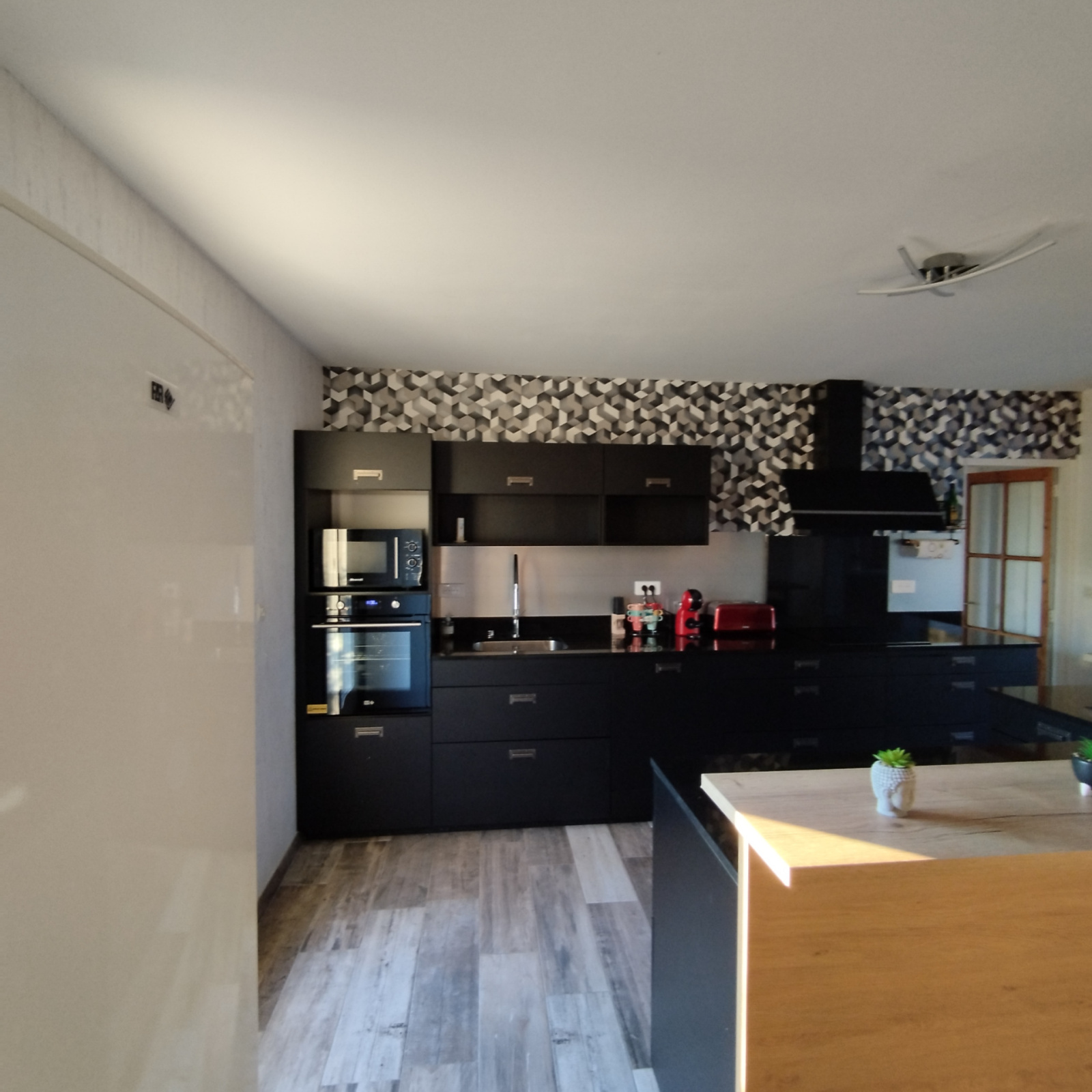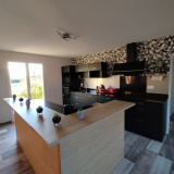 La cuisine intégrée, moderne et fonctionnelle, est ouverte sur le séjour et dispose d’un îlot central convivial. Elle bénéficie d’un accès direct vers l’extérieur, idéal pour profiter des beaux jours.