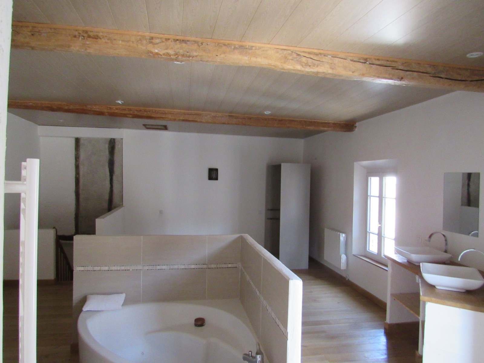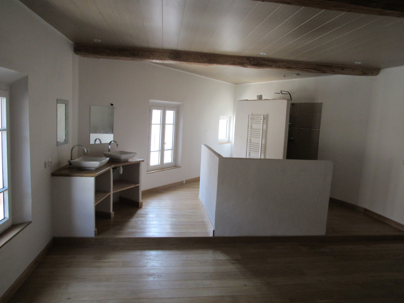 Le dernier niveau accueille une seconde chambre spacieuse, ouverte sur une superbe salle de bains équipée d’une baignoire, d’une douche, d’une double vasque et de wc. De grandes ouvertures apportent une lumière naturelle tout au long de la journée.