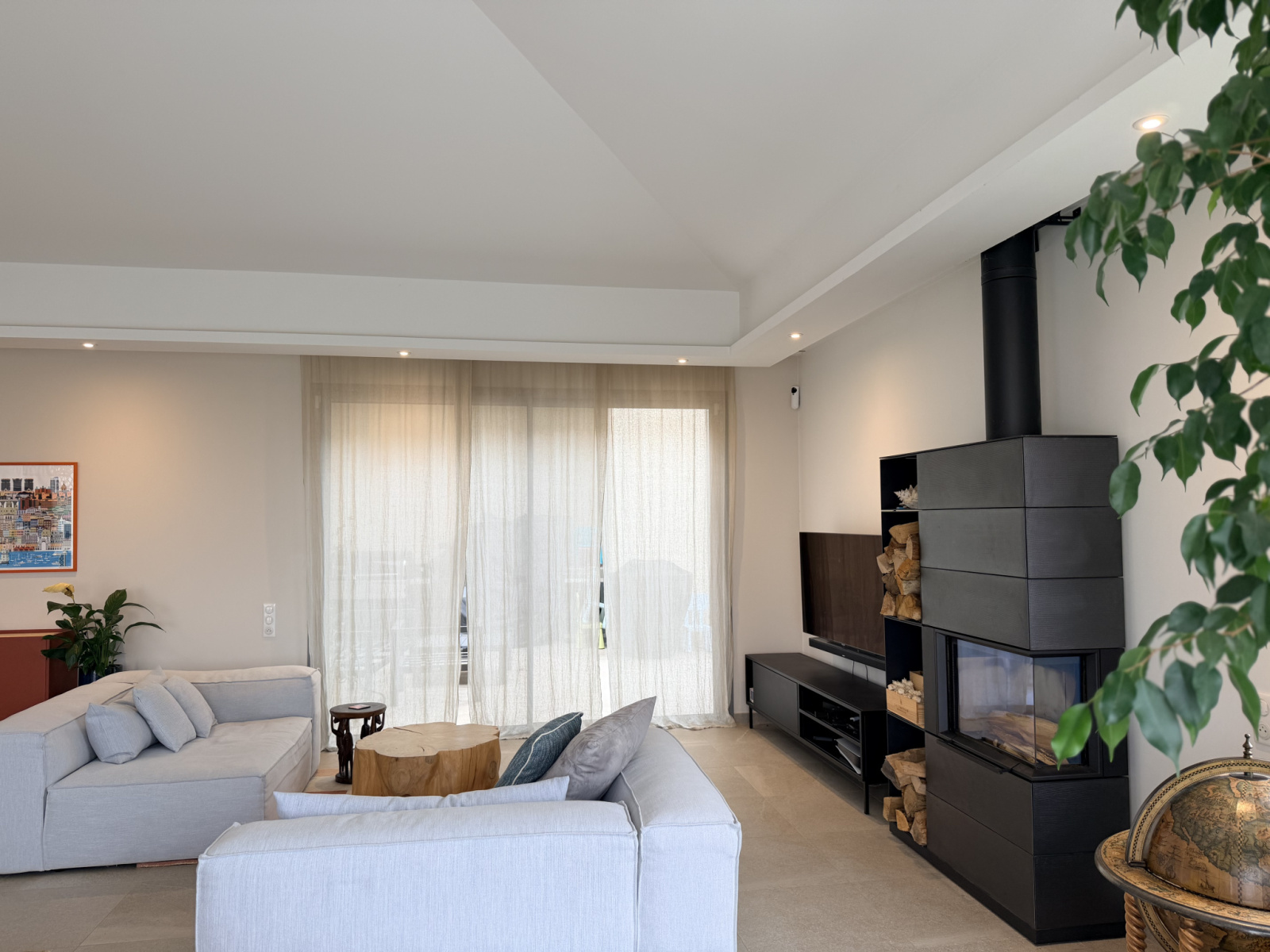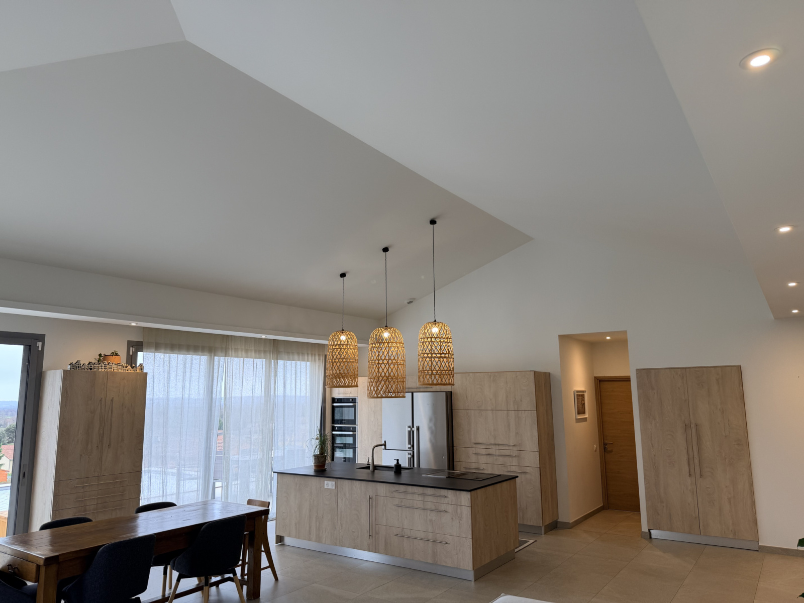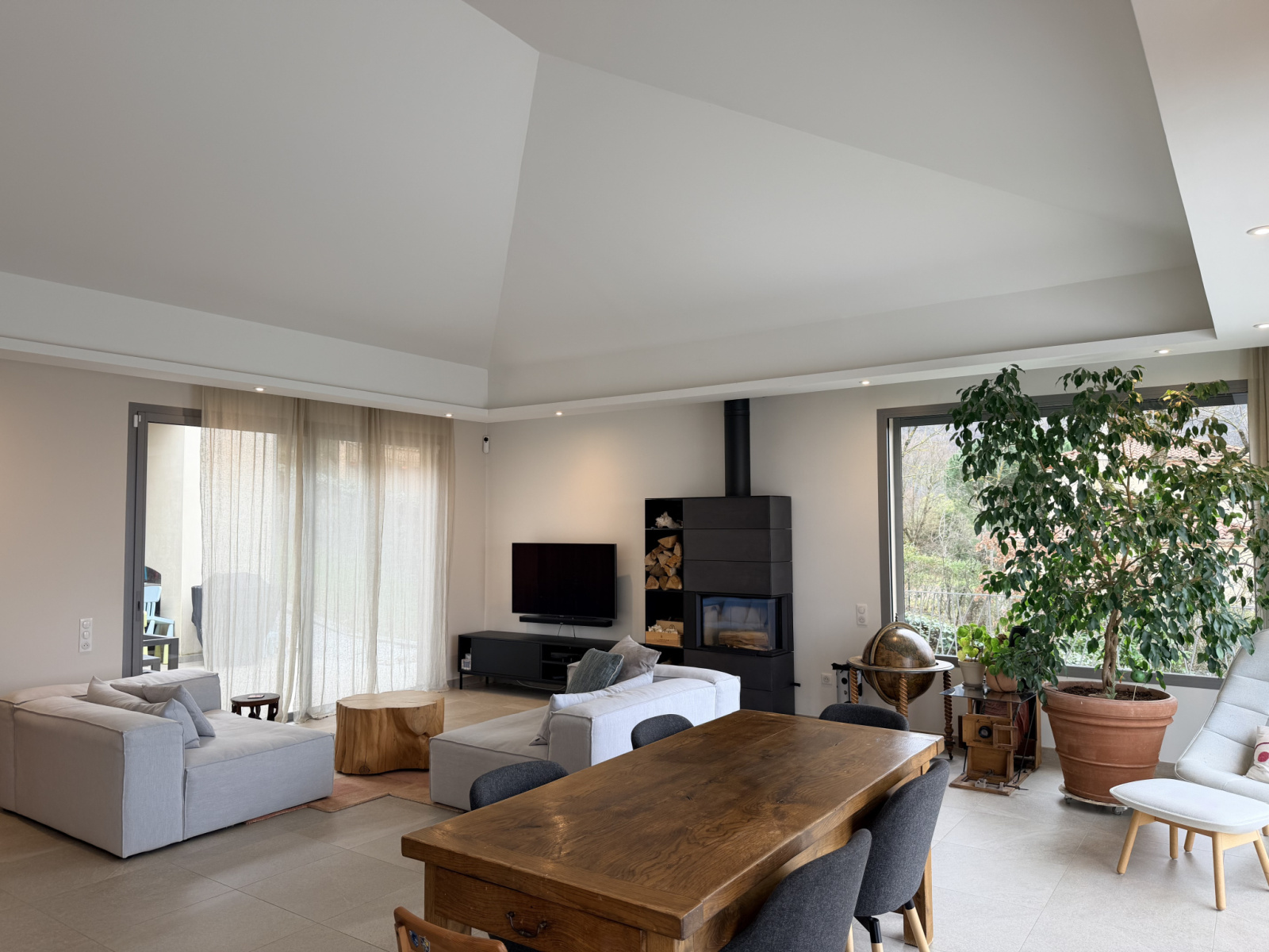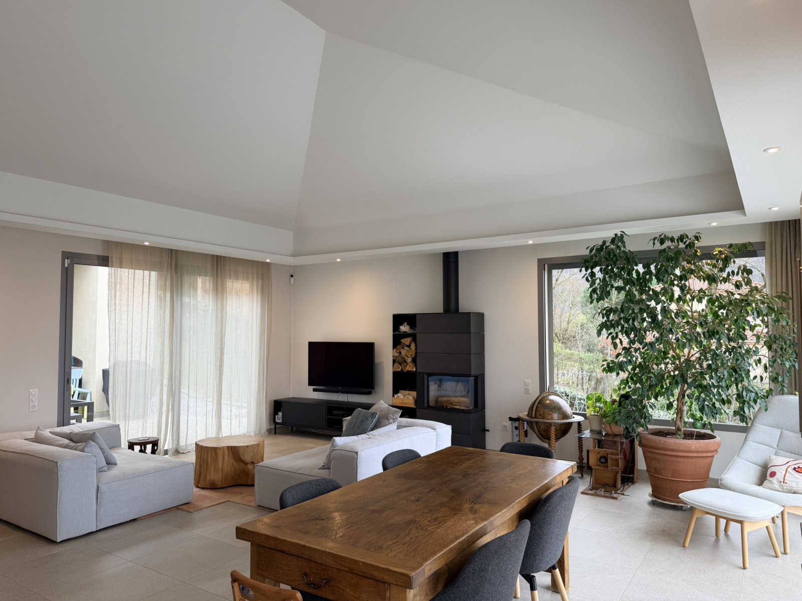 Trois majestueuses baies vitrées prolongent l’espace vers un patio intimiste et une vaste terrasse, créant une harmonie parfaite entre intérieur et extérieur.